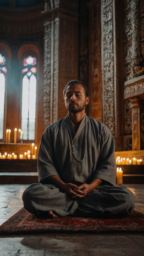 Leonardo_Kino_XL_man_in_deep_meditation_before_a_Cristian_alta_0